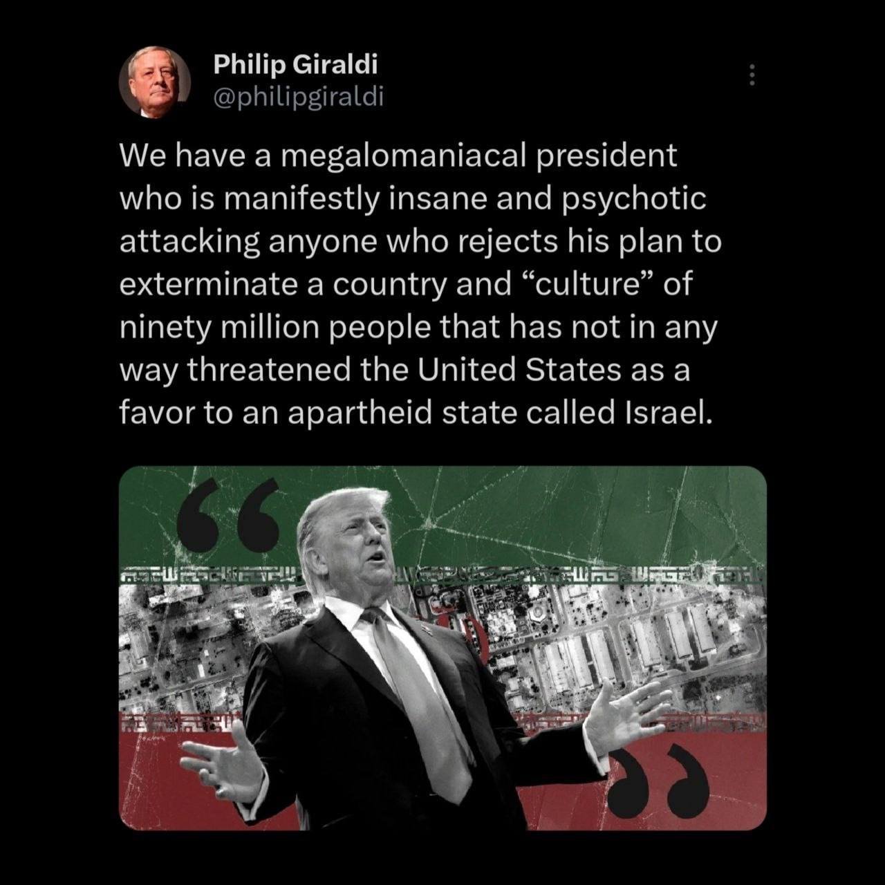 لدينا رئيسٌ متعجرفٌ، مجنونٌ ومريضٌ نفسيٌّ بوضوح. يهاجم كلَّ من يرفض خطته لتدمير دولةٍ وثقافةٍ تضمُّ تسعين مليون نسمةٍ لا تشكّل أيَّ تهديدٍ لأمريكا، وذلك كمعروفٍ لدولةِ أبارتهايد تُدعى إسرائيل.