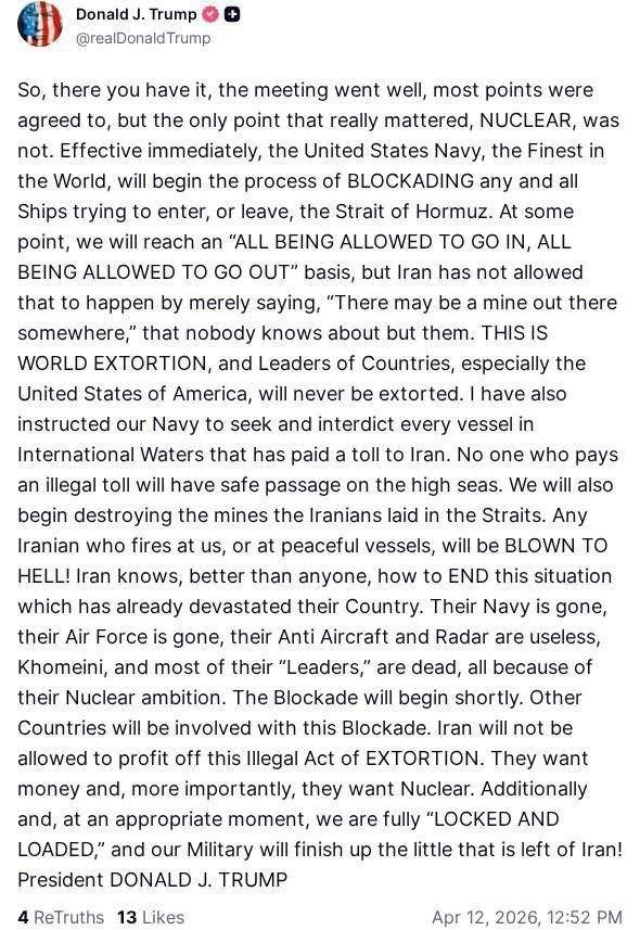 -سنبدأ أيضًا بتدمير الألغام التي زرعها الإيرانيون في المضائق، أي إيراني يطلق النار علينا، أو على سفن سلمية، سيُباد!