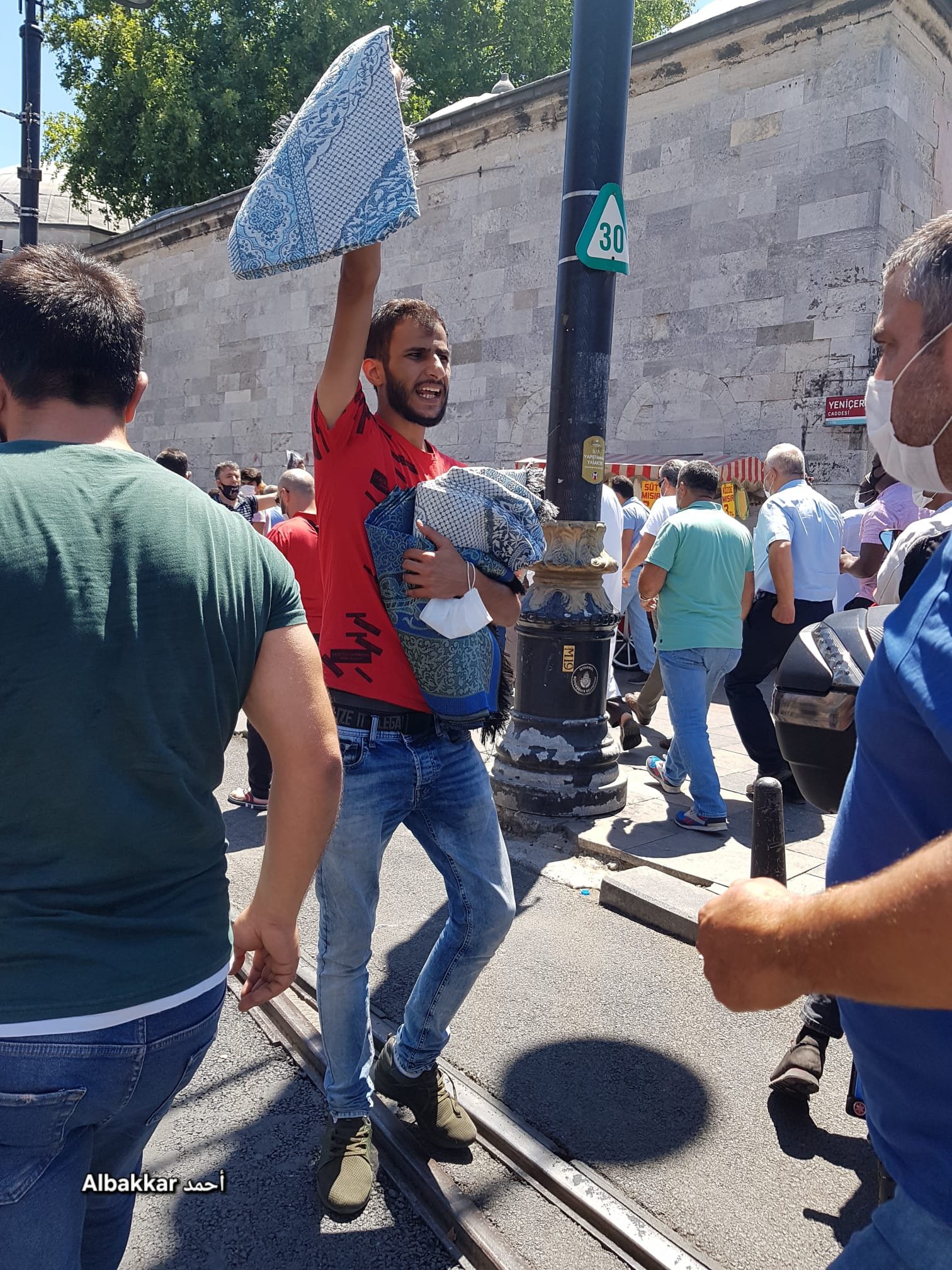 الرايات والأعلام خفّاقة. باعة البيارق والماء والسميد وسجادات الصلاة طوال الطريق. كلما تقدمنا رُفدنا بأقوام جُدد. البشاشة والفرح والاستبشار تعلو الوجوه. كأنما عودة الأذان والصلاة إلى هذا المكان انتصار تاريخي شعبي وعودة للروح.
