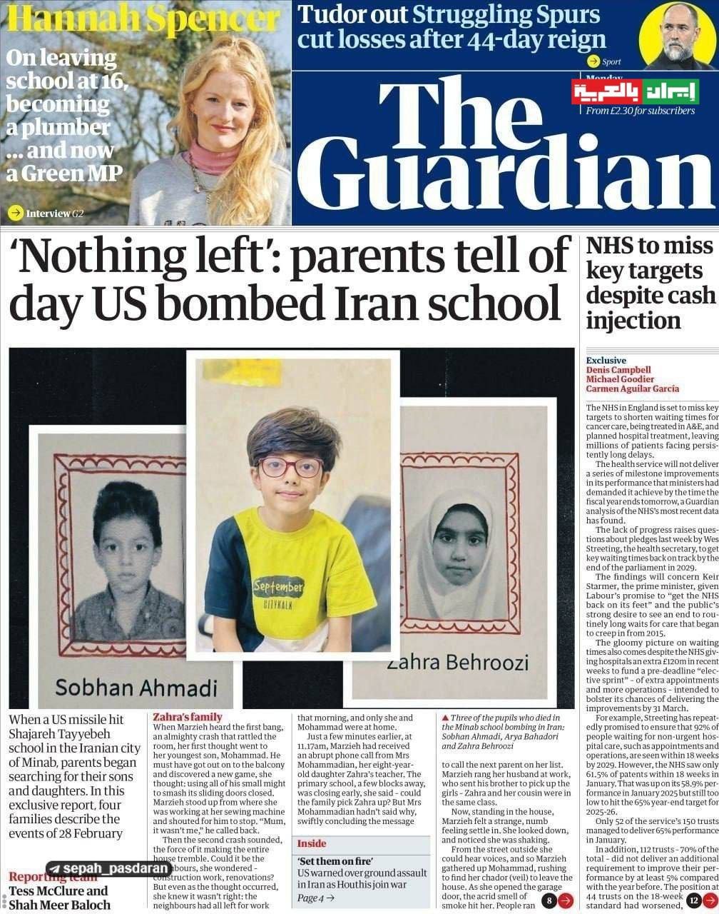غلاف صحيفة الغارديان يتزيّن بصورة طلاب مدرسة ميناب الذين استُشهدوا”